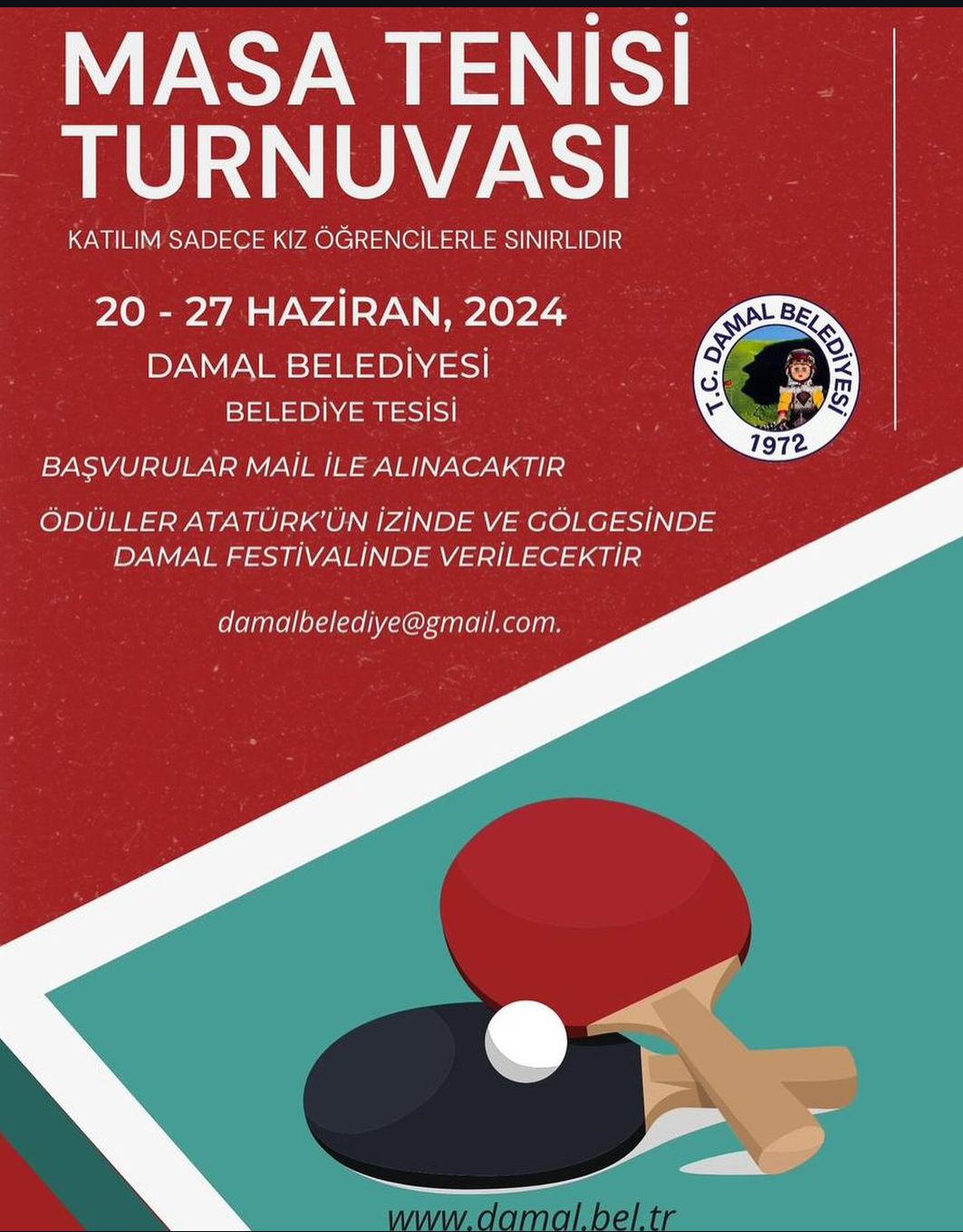 Organizasyonunu Damal Belediyesinin yaptığı ve Lise kız öğrencilerimizin katılım sağladığı Masa Tenisi Turnuvası 20 Haziran tarihinde başladı. 27 Haziran tarihinde final turnuvasının ödül töreni bu yıl 25.si düzenlenecek olan Atatürk'ün İzinde ve Gölgesinde ...