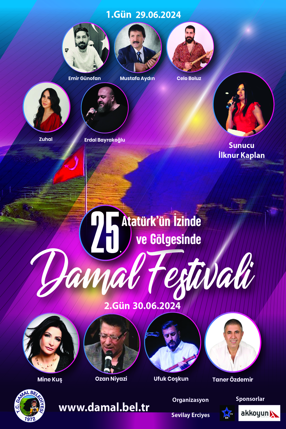 Bu yıl 25.'si düzenlenecek olan Atatürk'ün İzinde ve Gölgesinde 25. Damal Festivali 29 - 30 Haziran tarihleri arasında gerçekleşecektir. Festival programının birinci günü; Damal Festival alanında gerçekleşecek olup Sanatçı Performansları, ...